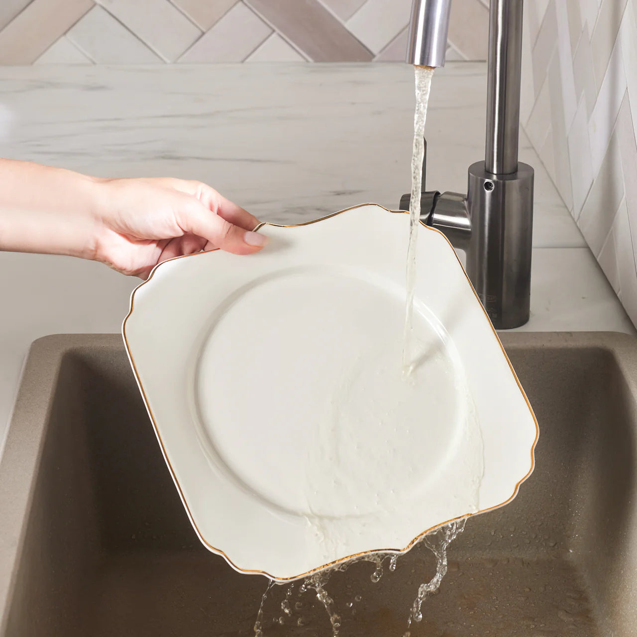 Karaca Stream Bone Vintage dinnerware combines modern lines, smooth transitions, and vintage gold details to add an elegant touch to any table. Its next-generation bone china construction makes it lightweight, durable, and highly polished.