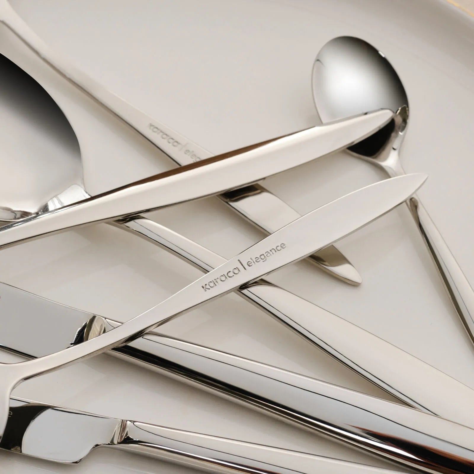 Karaca Elegance Novara is een speciale 84-delige bestekset die elegantie en moderne lijnen tegelijk naar uw tafel brengt. Novara, gemaakt van premium 18/10 roestvrij staal, biedt met zijn glanzende oppervlak, hoge duurzaamheid en opvallende ontwerp een perfecte ervaring voor zowel dagelijks gebruik als feestelijke diners.