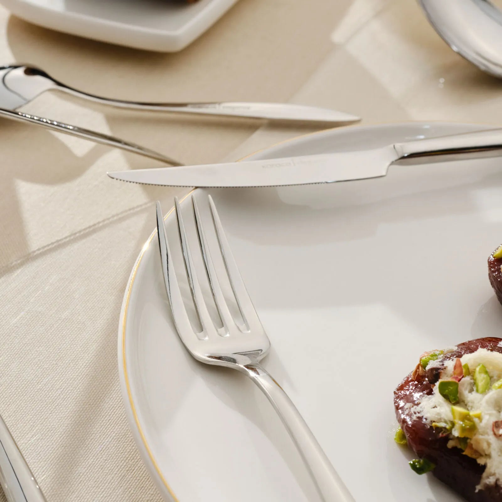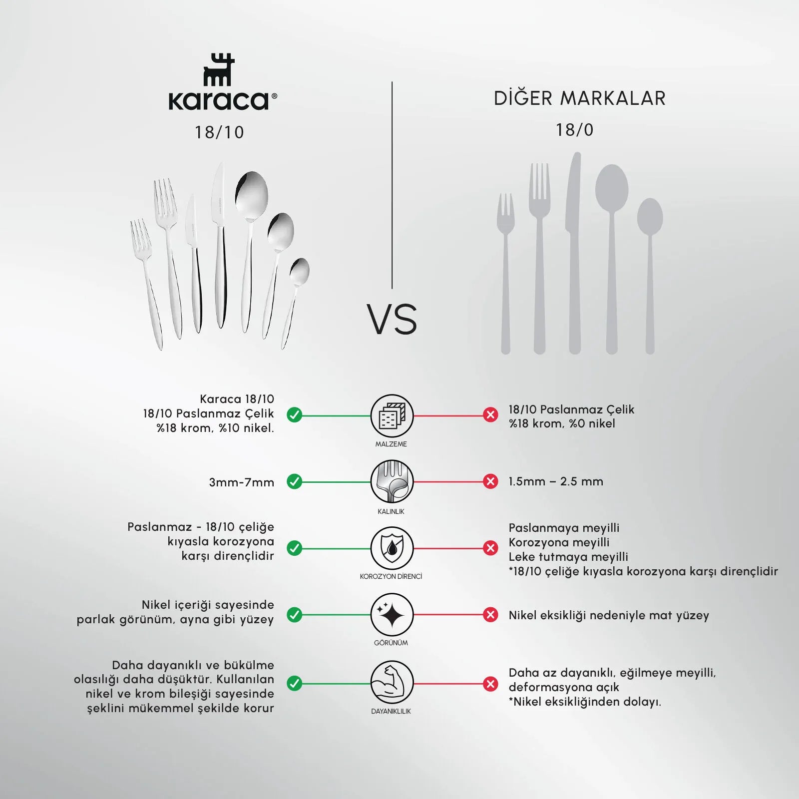 %18 chroom en %10 nikkel bevattende hoogwaardige staalstructuur zorgt ervoor dat de set zeer bestand is tegen roest, verkleuring, krassen en corrosie. De speciale productiedikte van de Elegance-collectie (3 mm – 7 mm) biedt volledige bescherming tegen buigen en vervormen. Dankzij het glanzende spiegeloppervlak geeft het prestige en elegantie aan uw tafel.