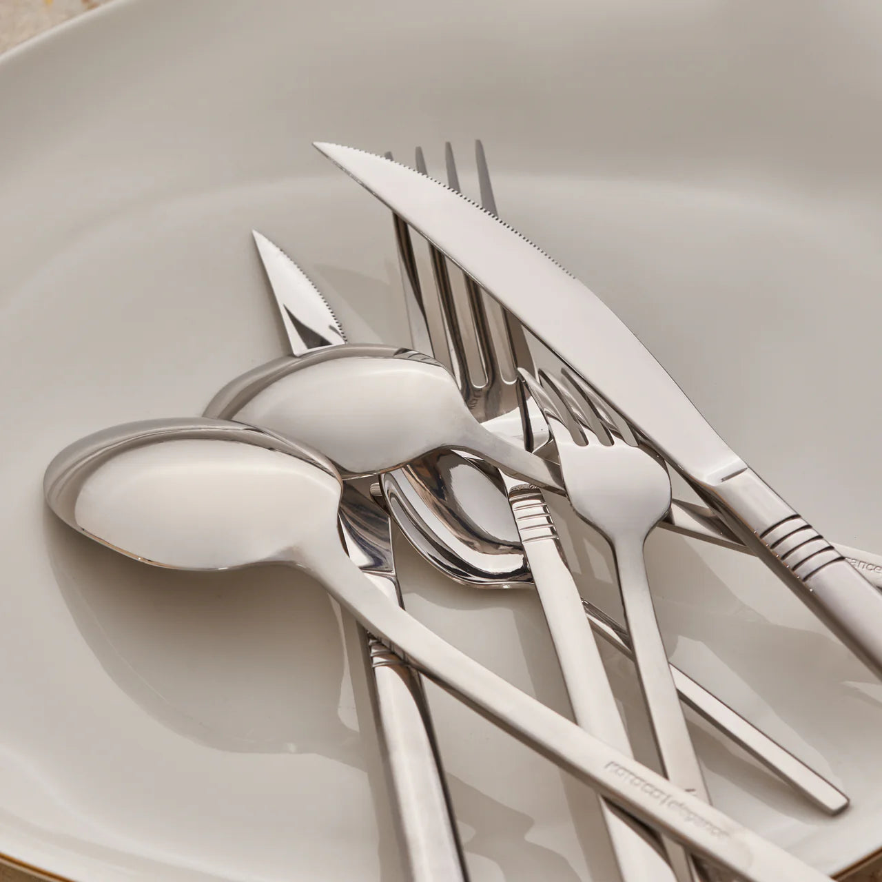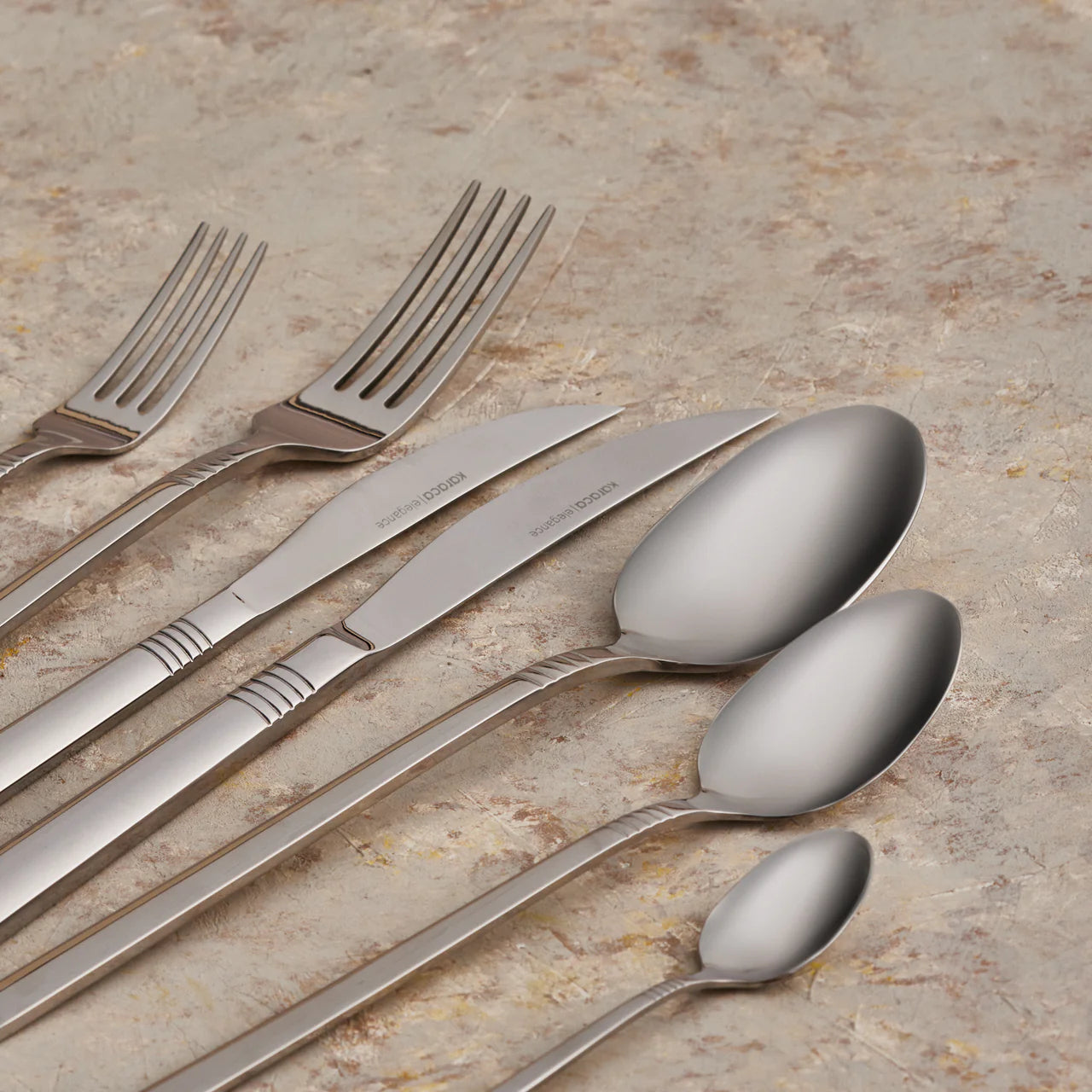 De Karaca Nil 91-delige vork-lepel-mes set is een premium set gemaakt van 18/10 roestvrij staal en biedt tijdloze elegantie voor zowel dagelijks gebruik als speciale gelegenheden. Dankzij het %18 chroom en %10 nikkel in de samenstelling biedt het hoge glans, extra duurzaamheid en uitstekende bescherming tegen corrosie. Het spiegelglanzende oppervlak behoudt zijn schittering als op de eerste dag, zelfs na jaren.