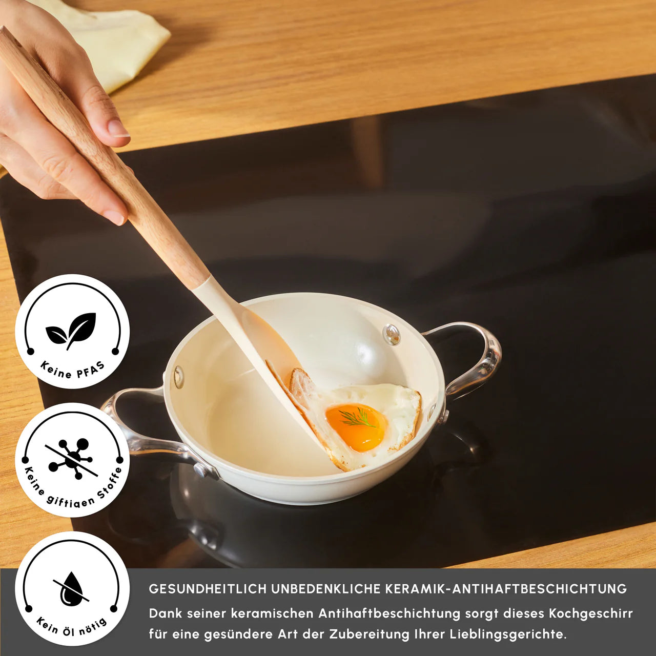 Dankzij het speciale oppervlak geproduceerd met SwissCrystal-technologie biedt het uitstekende anti-aanbak eigenschappen. Je kunt eieren, menemen, sauzen en ontbijtgerechten gemakkelijk bereiden zonder olie te gebruiken. De coating versterkt met Zwitserse kristallen bevat geen schadelijke chemicaliën zoals PFAS en biedt een gezonde kookmogelijkheid.