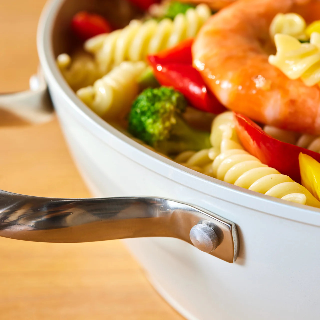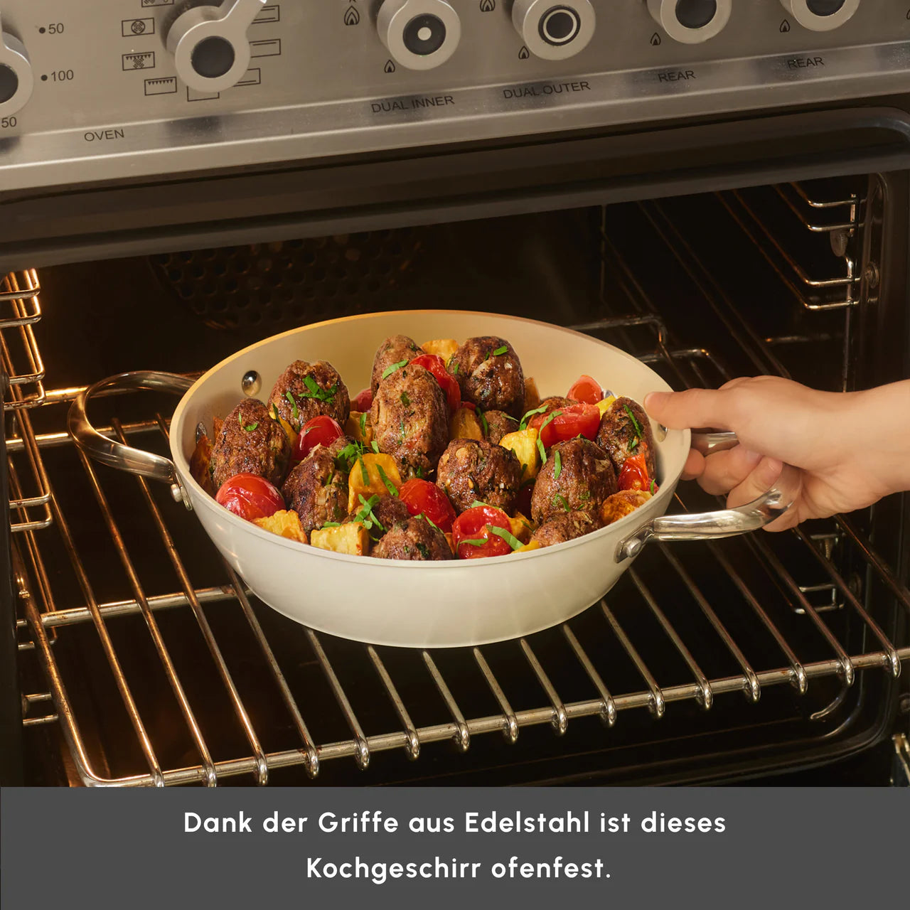 Met de speciaal ontwikkelde antiaanbaklaag van SwissCrystal technologie kun je karnıyarık, groentegerechten, vlees en kip zonder olie eenvoudig bereiden. De coating, versterkt met Zwitserse kristallen, bevat geen schadelijke chemicaliën zoals PFAS en biedt een gezonde kookmogelijkheid.