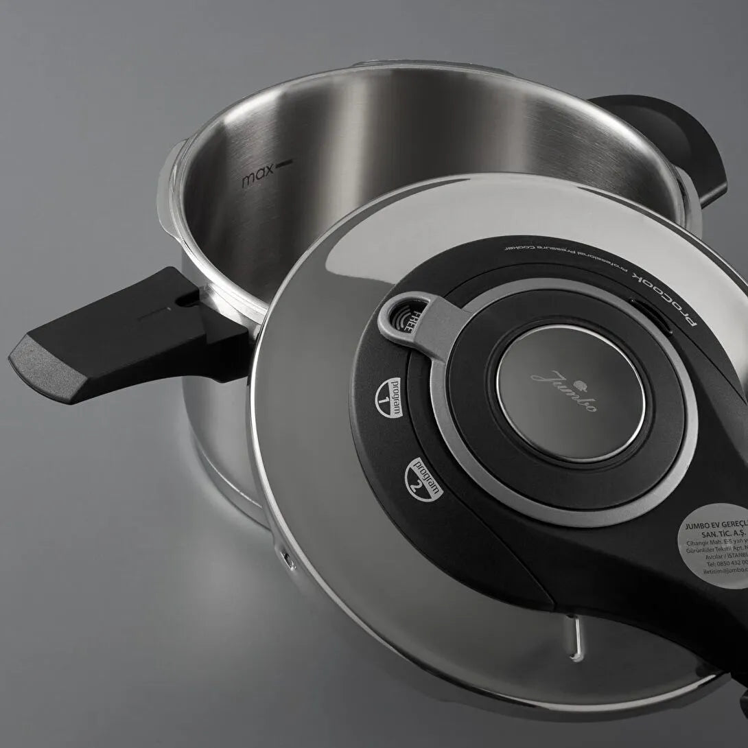 Jumbo Procook 4+6 L İkili Düdüklü Tencere Seti, yüksek kalite paslanmaz çelik yapısı ve gelişmiş güvenlik sistemleriyle sağlıklı ve hızlı pişirme deneyimi sunar. 4 ve 6 litrelik iki farklı tencere ile gelen bu set, 3 kademeli pişirme ayarı sayesinde sebzeden ete kadar tüm yemekleri ideal sürede ve tam kıvamında hazırlamanıza yardımcı olur.