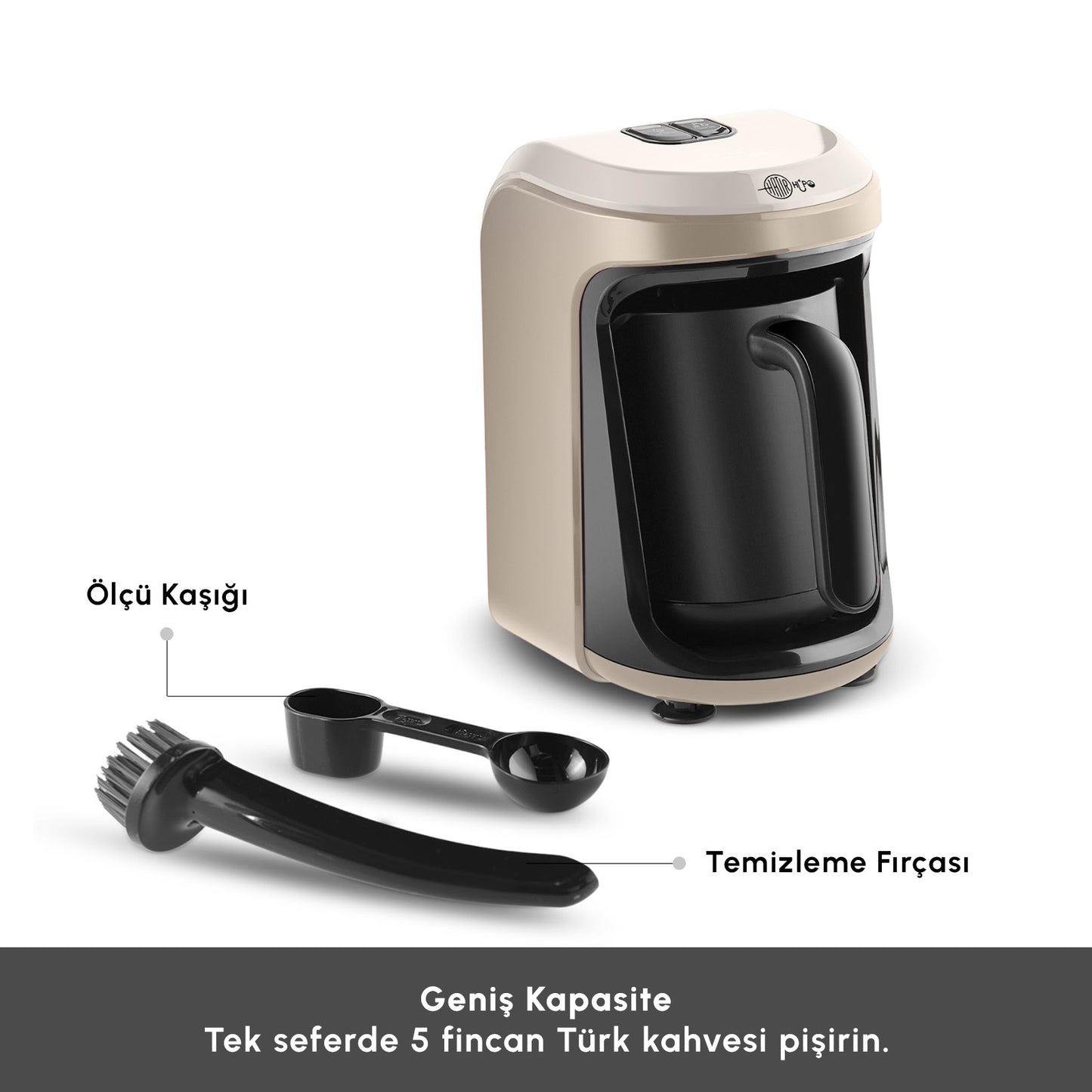 Şık bej tasarımı, mutfağınıza modern bir dokunuş kazandırırken; 5 fincan kapasitesi sayesinde kalabalık misafirlerinize bile rahatlıkla ikramda bulunabilirsiniz. Temizleme fırçası ve ölçü kaşığı gibi aksesuarlar ile pratik kullanım sağlar. Üstelik 2 yıl garanti ile güvenle kullanabilirsiniz.