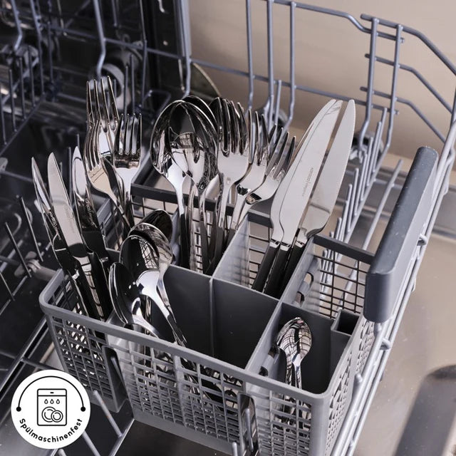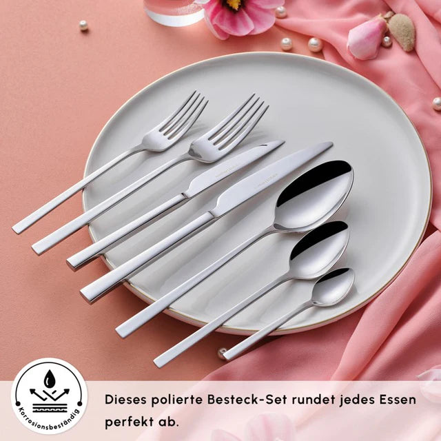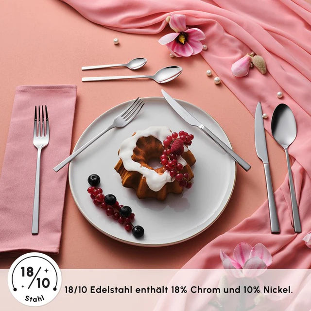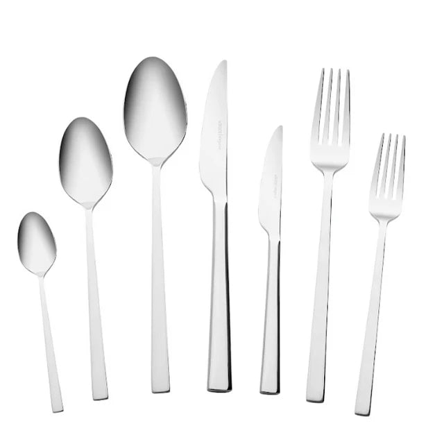 Set; yemek çatalı, kaşığı ve bıçağının yanı sıra tatlı çatalı, tatlı kaşığı, tatlı bıçağı ve çay kaşıklarından oluşur. Bu sayede sofralarda uyumlu ve bütüncül bir sunum sağlar. Platin renkli şık tasarımı, modern ve zamansız çizgileriyle her sofra düzenine kolayca uyum sağlar.