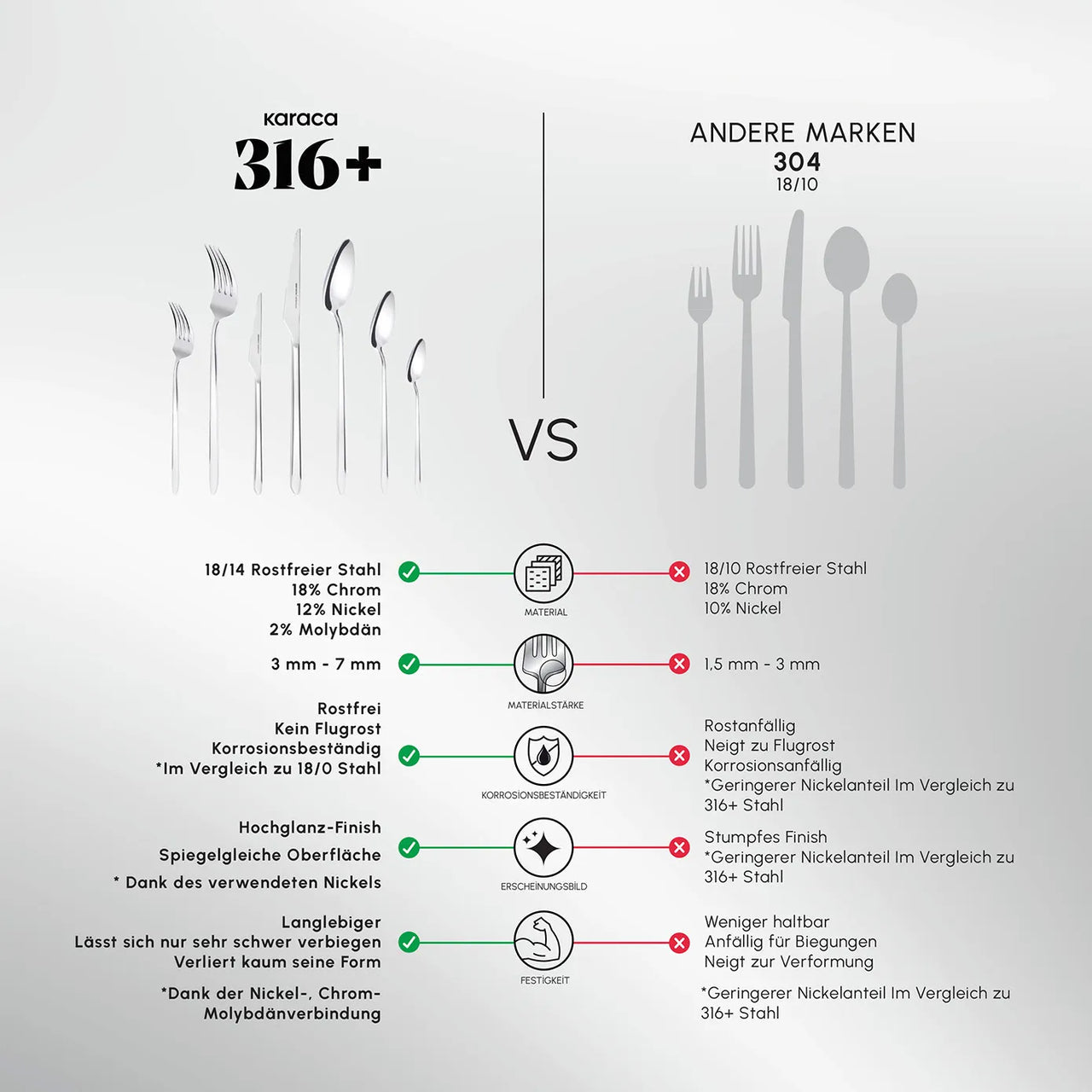 Dayanıklılığın kaynağı Molibden elementi, paslanmaya ve korozyona karşı üstün koruma sağlar. Bu sayede Stark serisi, standart çeliğe göre %53 daha az çizilir, %25 daha fazla dayanıklılık gösterir. Uzun yıllar parlaklığını koruyan yapısıyla hem günlük kullanımda hem de özel davetlerde sofralarınıza değer katar.